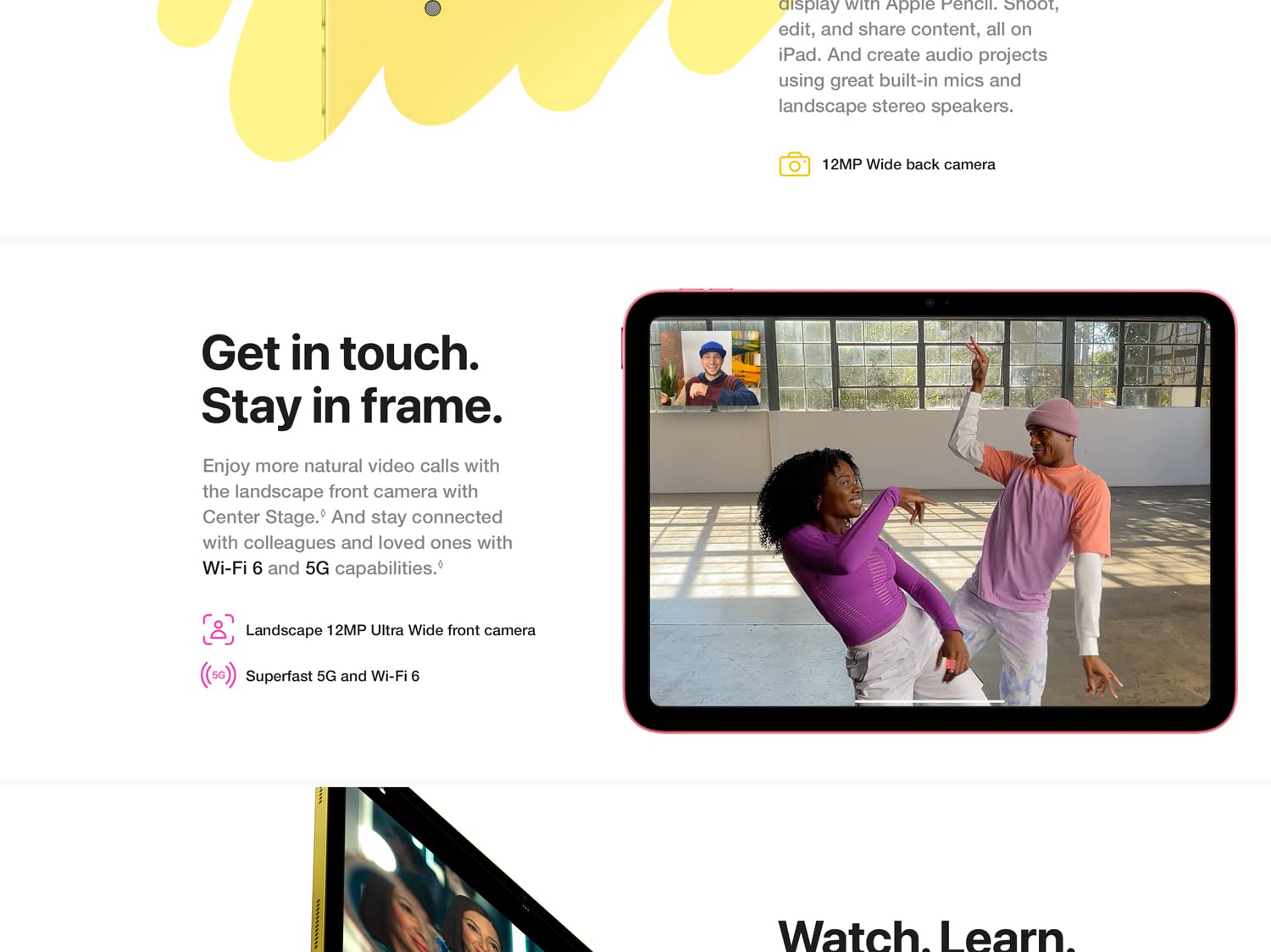 • Landscape 12MP Ultra Wide front camera with Center Stage