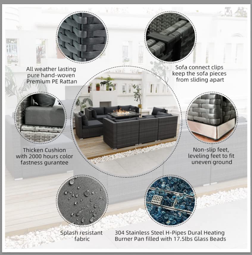 【Home&Garden】Large Size High Back PE Rattan Patio Furniture Sectional Sofa Sets with Fire Pit Table