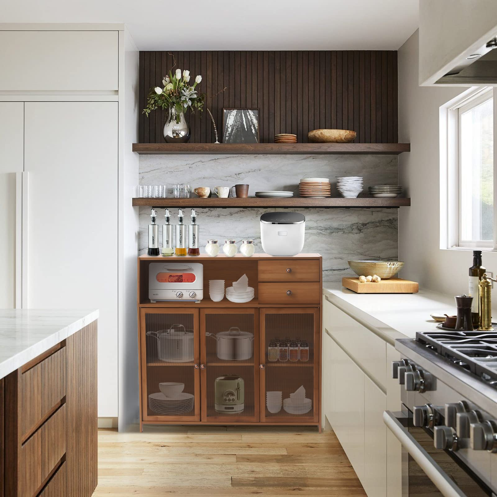 【Furniture】Natural Bamboo Buffet Sideboard Cabinet, 39 Inch Kitchen Sideboard Cabinet with 3 Doors