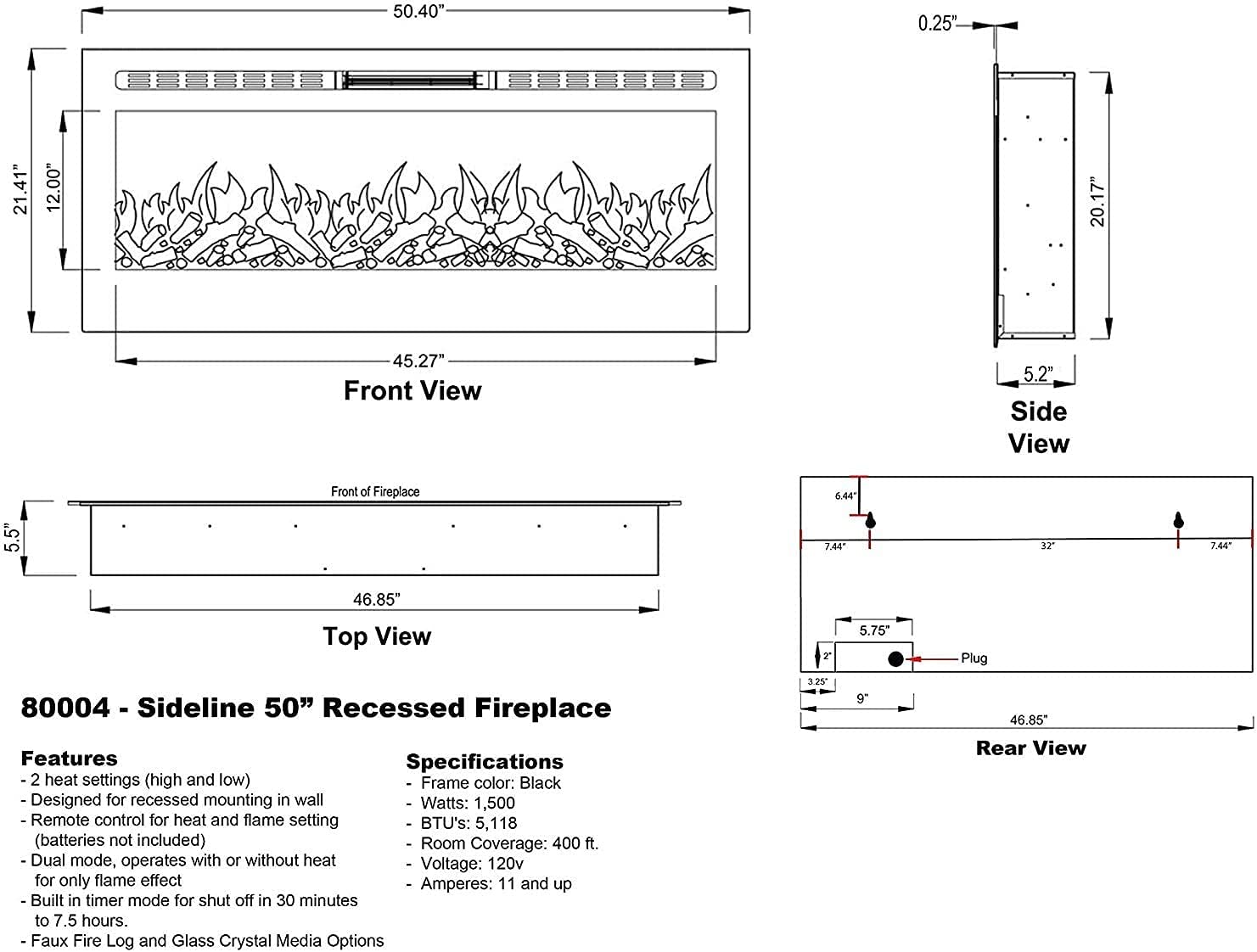 Touchstone 80004 - The Sideline Electric Fireplace - 50 Inch Wide - in Wall Recessed - 5 Flame Settings - Realistic 3 Color Flame - 1500/750 Watt Heater - (Black) - Log & Crystal Hearth Options