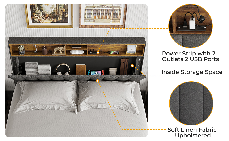 Size Queen Size Color Dark Grey & Rustic Brown Material Solid Wood & Linen Fabric & Metal Product Dimensions 84’’L x 60.6’’W x (43.7’’-47.7’’)H --- Adjustable Height Headboard Weight Capacity 880 LBS Feature 1 Power Strip with 2 Outlets & 2 USB Ports Feature 2 Storage Headboard with Internal Storage Space Package Content Bed frame, Storage Headboard, Power Strip, Wood Slats, Assembly Kit, Instructions (Mattress Not Included) Assembly Required Easy Assembly Required Box Spring Required No