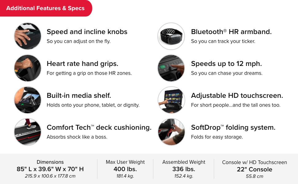 - 22" x 60" running path with Comfort Tech deck cushioning and speed up to 12 MPH